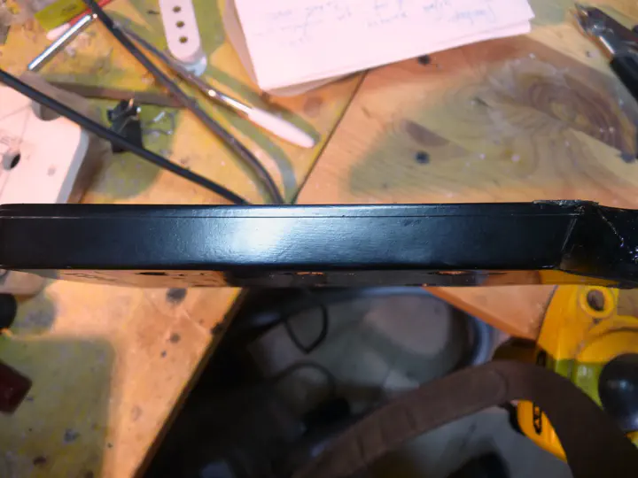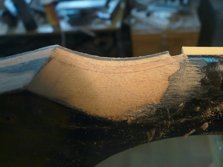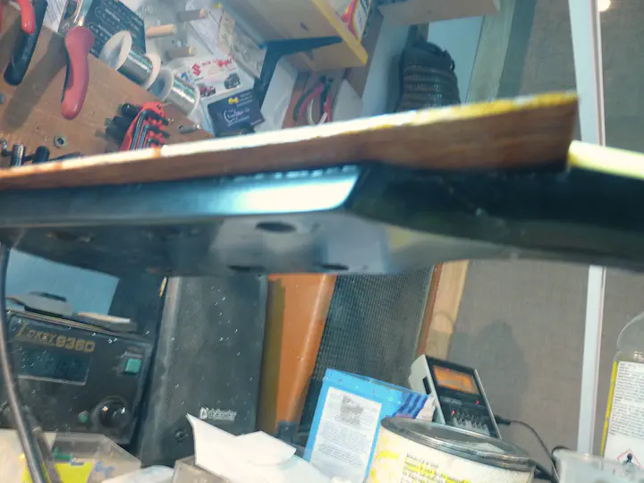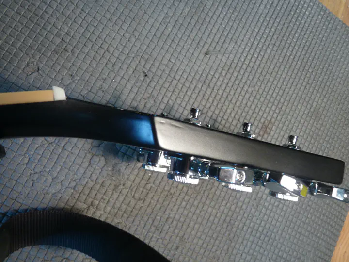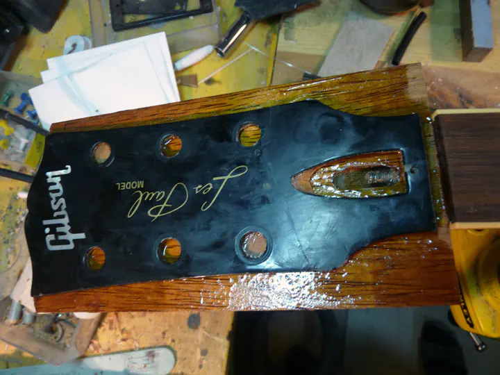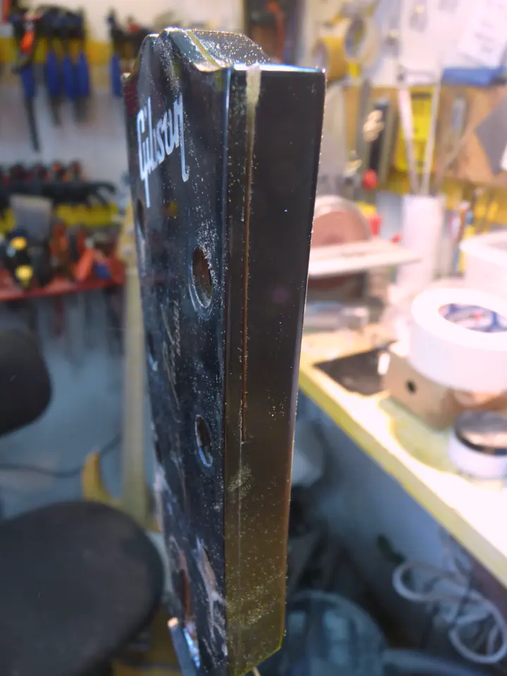 А вот следы широкого края распила. Сверху остатки гибсоновского лака (это нормально, дошлифуется еще), а вот снизу, под пластиной, виден слой эпоксидки. В данном случае это не страшно. Но если бы гриф нужно было красить не в черный, а в прозрачный лак, пришлось бы мне снимать лишний миллиметр с головы грифа, чтобы полностью выровнять поверхность, и ставить пластину чуть потолще.