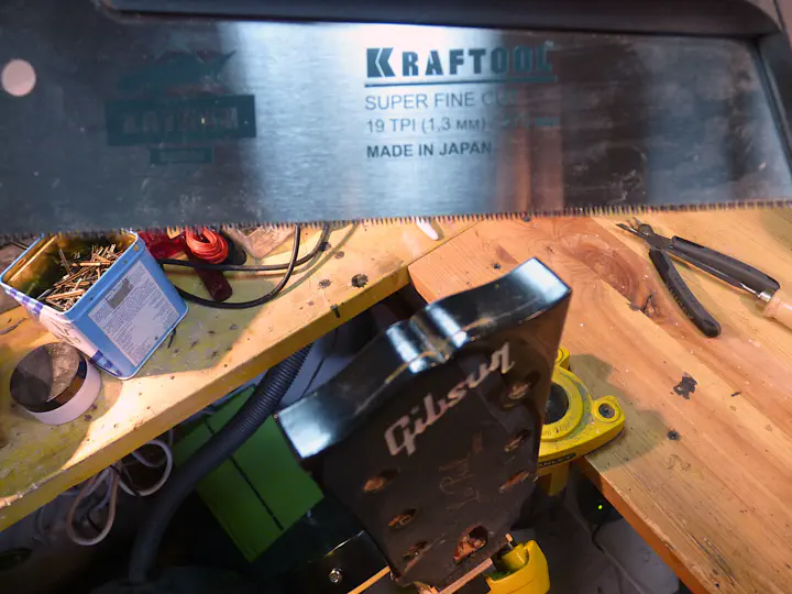 Вам кажется, что точно отпилить пластину таким образом невозможно? Мне тоже так кажется! Хотя уж этот-то гриф я точно распилил собственными руками и все вышло прилично.
