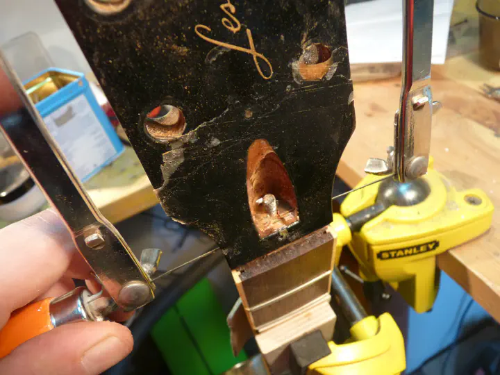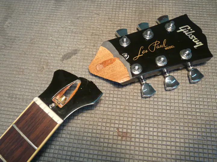 Но по головке грифа в целом опасения имеются. Ей ничего не стоит треснуть чуть выше или чуть ниже шва (я напомню, что головы на “гибсонах” ломаются даже от громкого хлопка в ладоши). Учитывая ценник за покраску, хорошо бы сразу как-нибудь усилить голову, чтобы снизить вероятность повторного ремонта и не красить потом заново. Эти соображения я высказал владельцу инструмента, и он со мной согласился.
