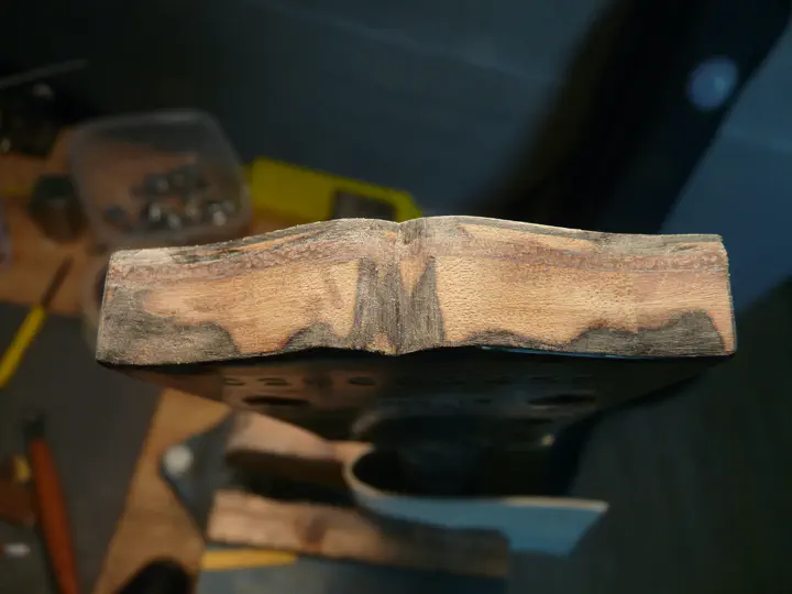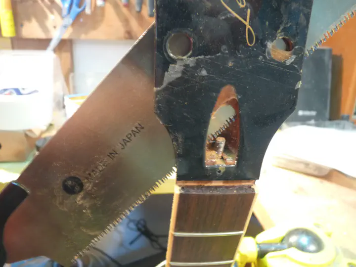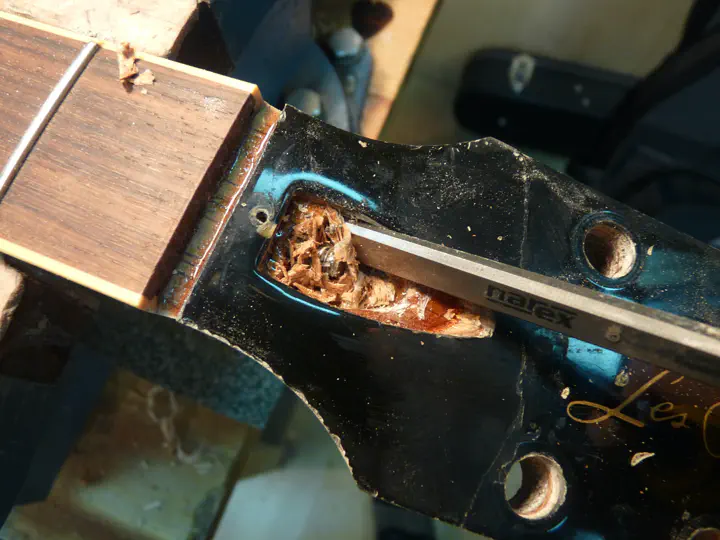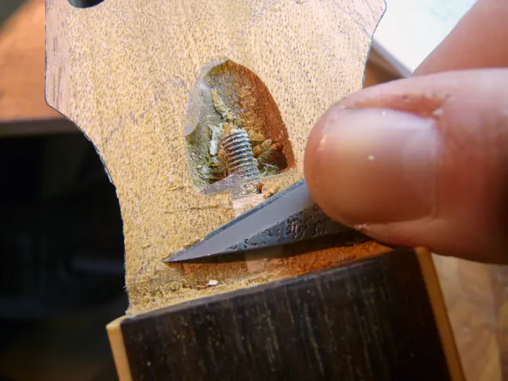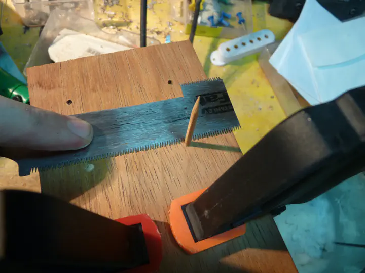 Кроме того, твердосплавное полотно за счет большей толщины позволяет обнаглеть окончательно и вставить пластину прямо в пропил. На гибсонах это затруднительно, но на других гитарах, где анкер торчит не так сильно, — почему бы и нет? Вот пропил твердосплавным полотном, в который я после минимальной обработки запихнул пластину из пау ферро и был таков.