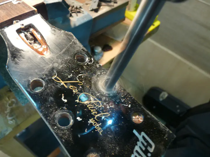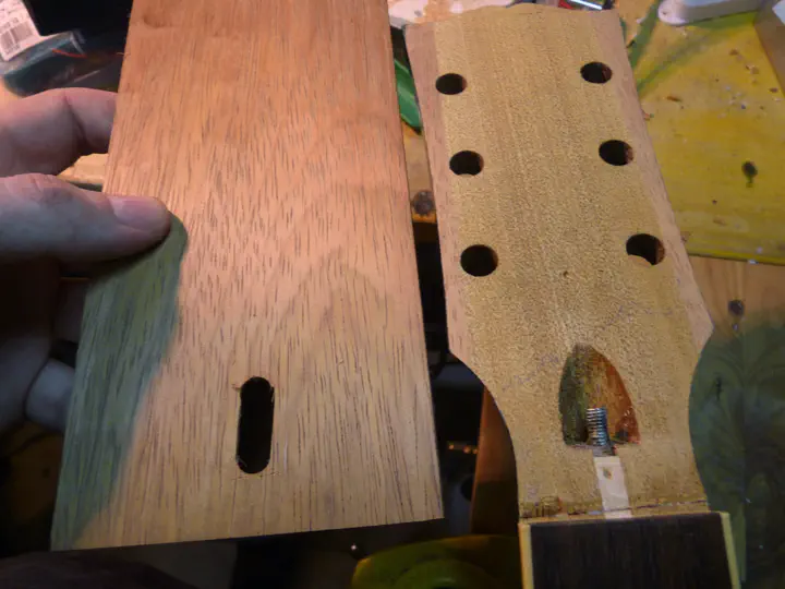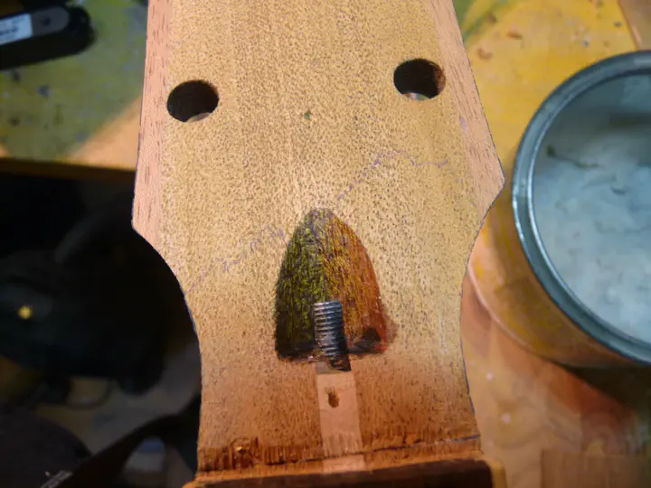 Высверливаю два отверстия под колки (с тыльной стороны грифа, они же там открыты), вставляю два низких шканта-десятки: