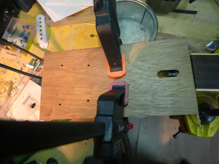 Затем пластина снимается, а шканты остаются. Теперь самое интересное: при склейке пластина сажается обратно на шканты, а ее отогнутый край с силой прижимается струбцинами к голове грифа. Результат — пластина с силой упирается в торец накладки и слегка тянет головку грифа назад, против натяжения струн, тем самым дополнительно противодействуя ударам сзади (наиболее опасным для головки грифа). Это, блин, гениально. Я не знаю, насколько это помогает, но как идея — очень круто.
