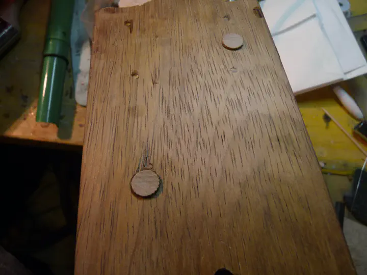 В отверстия плотно подгоняются шканты и обрезаются вровень с поверхностью. Все это без клея!