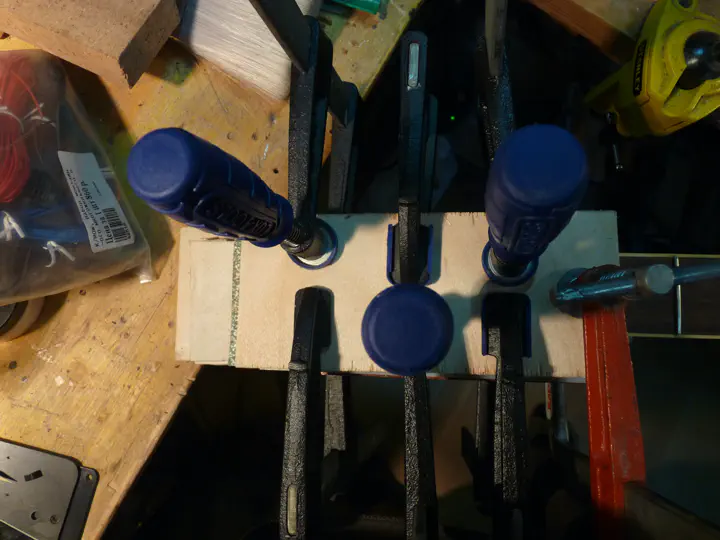 С этой пластиной есть одна мелкая фишка (тоже спасибо Десневу). Сначала она просто прижимается парой струбцин, без клея. Причем ее нижний край (который у порожка) упирается в верхнюю часть торца накладки — т.е. пластина с краю слегка отогнута вверх. Сверлятся четыре небольших отверстия.