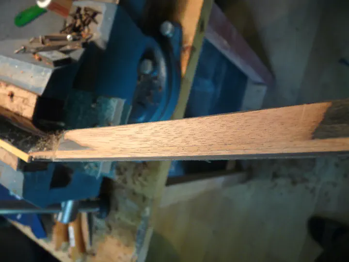 Беру дощечку из чего-то краснодеревянного. Толщина ее — чуть больше двух мм, очень жесткая и упругая, хрен сломаешь. Разумеется, я заранее проверил, что финальная толщина головки с ней не будет чрезмерной. Вырезаю отверстие под анкер, чтоб не мешал клеить. Делаю на торце скос, чтобы в накладку упирался не угол, а плоскость.