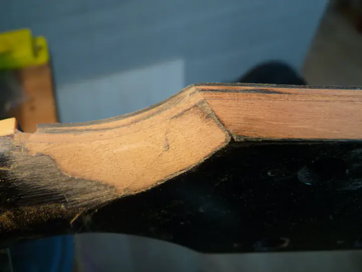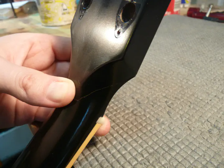 Разбираю гитару, прикидываю план действий. Разлом очень хороший, чистый — что не удивительно, потому что идет он вдоль волокон. Но фибру, конечно, так просто не восстановишь, придется красить.