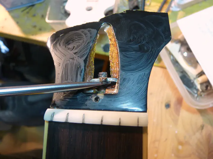 При отделении “лица” от головки грифа немного расширился край пропила (очевидно, потому, что за пилой я следил с другой стороны головы, а этой не уделил должного внимания). Вместо того, чтобы сошлифовывать всю головку грифа ради одного уголка, я просто зашпатлевал его эпоксидкой. Виноватым себя не признаю, в рамках ремонта это было вполне допустимо. Речь-то идет о полумиллиметровой щели (а темная полоска над усиливающей пластиной — это фабричный лак; если чуть пошлифовать, то вылезет деревяшка).