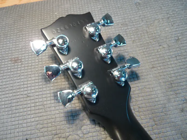 Есть интересный мелкий косяк: в паре мест, где остались пятна гибсоновского лака (см. выше), новый слой немного просел. Это легко вышлифовать, но мы с владельцем гитары решили, что подождем еще полгода, чтобы нитролак дал полную усадку. Вероятно, стоит сдирать родной лак целиком, пускай и с небольшим нарушением исходной геометрии грифа. Нитруха, что поделать…