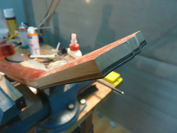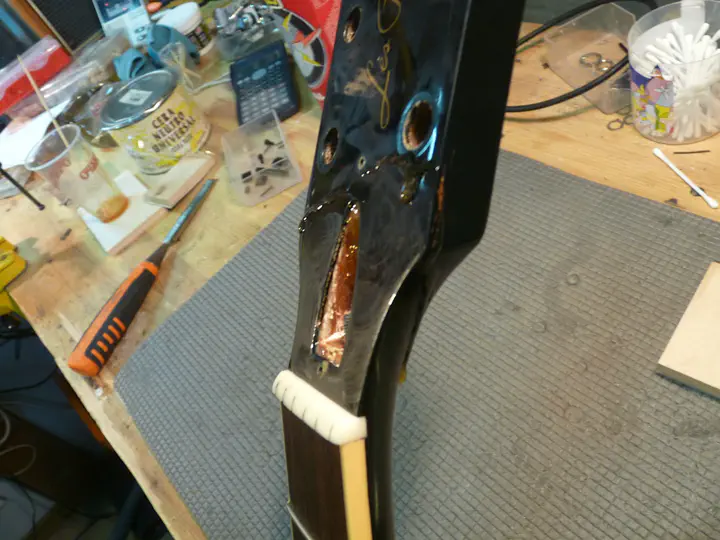 Можно было бы содрать лишнюю эпоксидку, подшкурить, покрасить гриф и собрать гитару. Клеевой шов отличный, беспокойства за него нет.