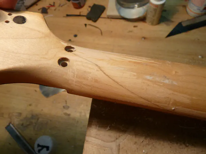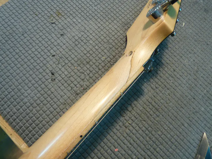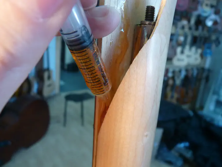 Цепляю гриф так, чтобы смола стекала по трещине вниз.