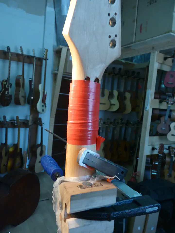 Посадить на гриф голову не так-то просто, потому что та здорово гуляет влево-вправо и никакой очевидной возможности ее закрепить нет. Мне пришло в голову не очень изящное, но, как оказалось, эффективное решение: плотно обмотать область склейки несколькими слоями ПВХ-изоленты. В данном случае это даже круче, чем любимые народом резиновые ленты. Фишка в том, что к изоленте смола в принципе не липнет, что очень облегчает очистку грифа. При этом стягивает склейку эта изолента очень хорошо (особенно если наматывать ее слегка натянутой).