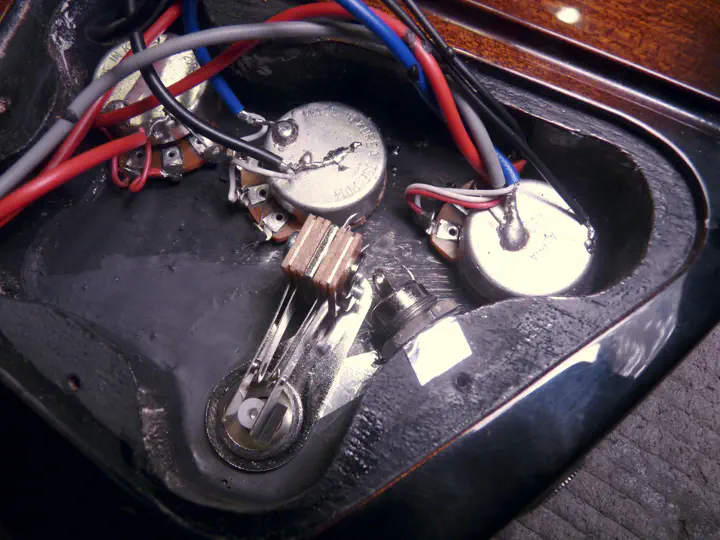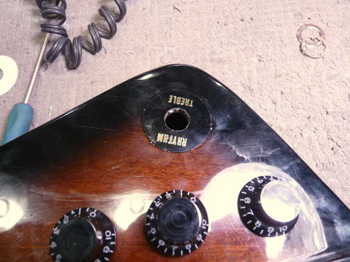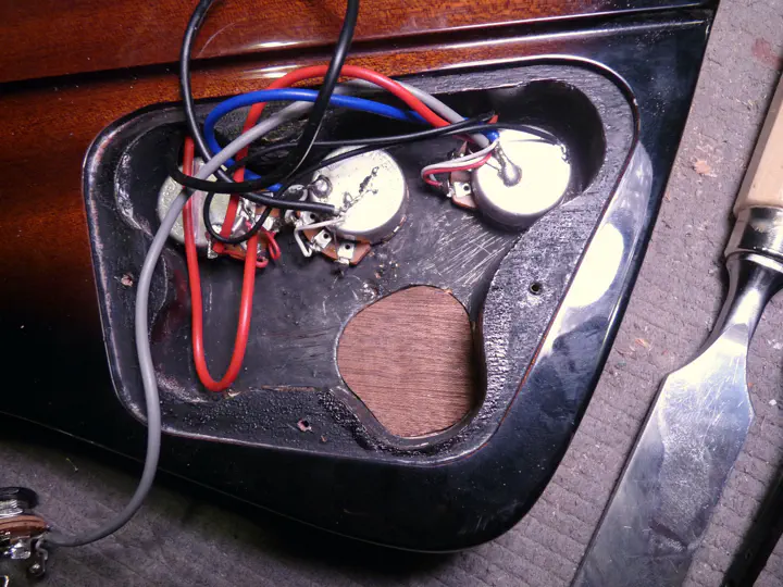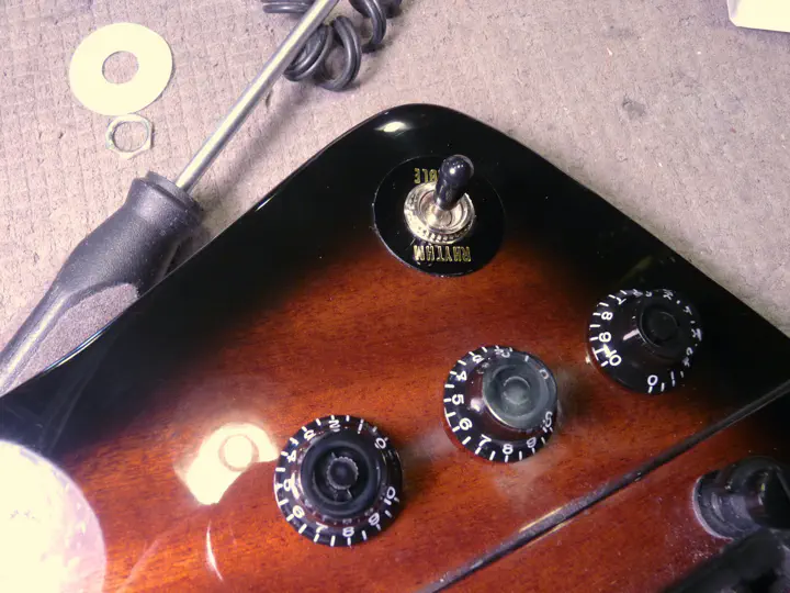 А что, зачем ставить гнездо обратно в такое нехорошее место?.. Нет уж, пусть будет сбоку, как положено. Оттуда его хотя бы трудно выломать. А на освободившееся место мы решили поставить гибсоновский переключатель. Можно было и потенциометр (чтобы получились две громкости и два тембра), но переклюк показался заказчику полезнее. Темную заплатку любой из вариантов закрыл бы.