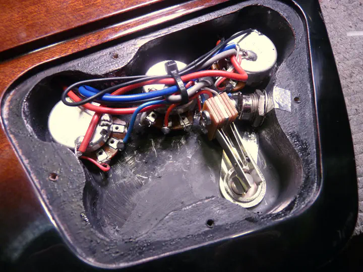 Эпифон, конечно, молодец. У оригинального тандербёрда гнездо ставится в боковину корпуса, но на эпифоне его перенесли в темброблок, по образцу SG. Поскольку корпус в этом месте еще тоньше, чем на SG, — пришлось сделать переднюю стенку очень тонкой, чтобы джек не упирался в крышку темброблока.