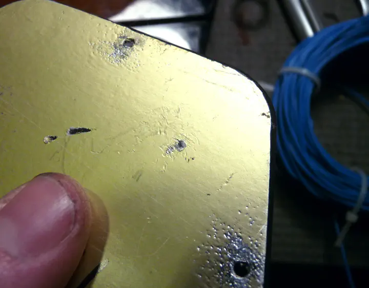 Вот, кстати, крышка от темброблока. Дырка в фольге между отверстиями под шурупы проковыряна кончиком джека. Как играло — непонятно. И это при предельно низкой установке гнезда.
