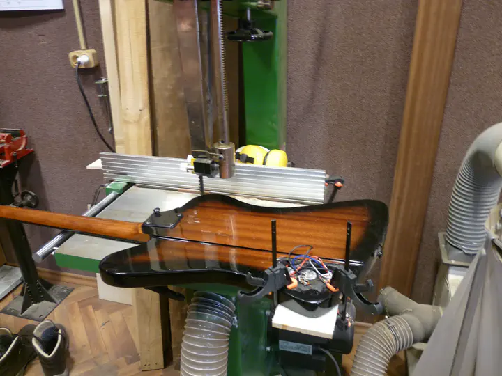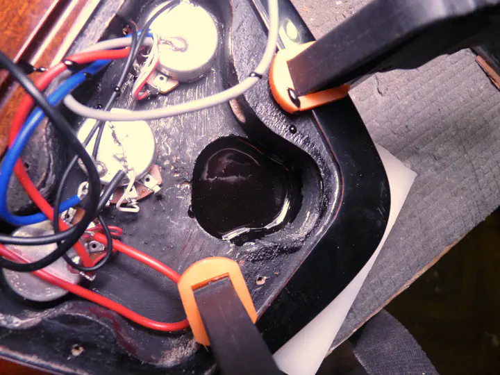 После этого гитара долго удерживается в горизонтальном положении, чтобы смола застыла c ровной поверхностью. Не вредно первые минут двадцать проверять, нет ли просадки, и по необходимости подливать каплю-другую. Эпоксидка впитывается в древесину, хоть и медленно.