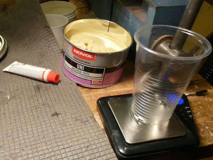 Два компонента шпатлевки смешиваются в соотношении около 50:1. На глаз это хрен отмеряешь. Еще раз посоветую завести маленькие электронные весы. Они стоят меньше тысячи рублей и решают вопрос смешивания эпоксидок, лаков, шпаклевок и чего угодно еще. А вопрос этот стоит очень остро. В “автомаге”, например, консультанты вытаскивают тюбики с отвердителем из упаковок со шпатлевкой и прячут поближе к кассе, - иначе их тырят люди, которые готовили смесь как попало и потому извели весь свой отвердитель :-) Короче, купите весы.