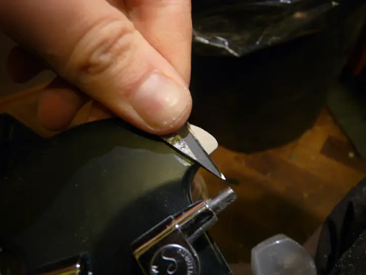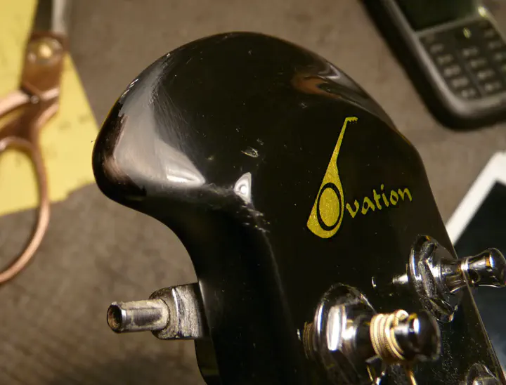 У гитары гастролирующего музыканта трудная жизнь. С ней ходят, бегают, ее постоянно перекладывают с места на место, возят в багажном отделении и так далее. Поэтому все выпирающие углы рано или поздно будут отбиты. В первую очередь те, которые выступают поперек древесных волокон. Как, например, на этом “Овейшне”: