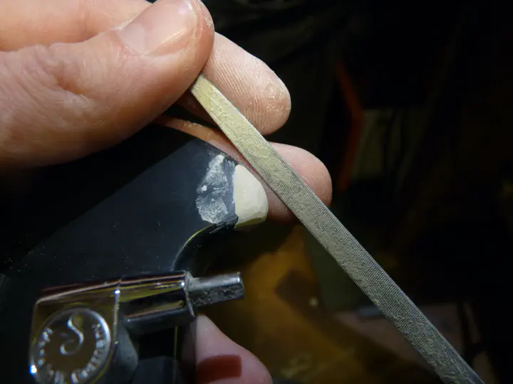 Бор-машиной трудно довести мелкие детали. Я перехожу на свой любимый инструмент: длинный полукруглый надфиль. По-моему, им работать с выпуклыми контурами удобнее всего. Одна сторона у него плоская, а другая - выпуклая с большим радиусом. Такой профиль называется полуфогольцевым.