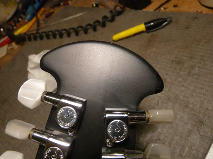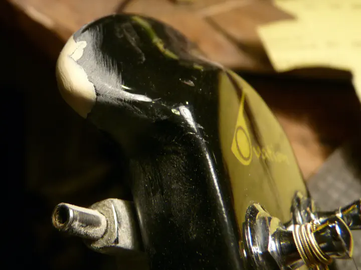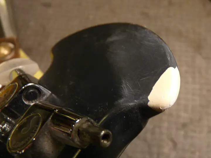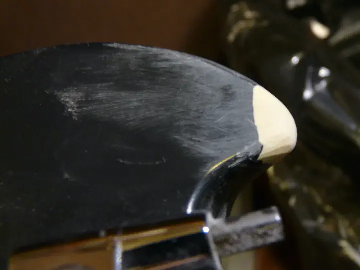 Но я считаю, что в данном случае это совершенно лишнее: под глухим покрытием что дерево, что не дерево - без разницы. Особенно учитывая смехотворный размер отколовшейся деревяшки и полное отсутствие нагрузки. Если бы инструмент был крыт прозрачным лаком - тогда да, “деревянная” реставрация была бы наилучшим вариантом. А тут будем обходиться химией.