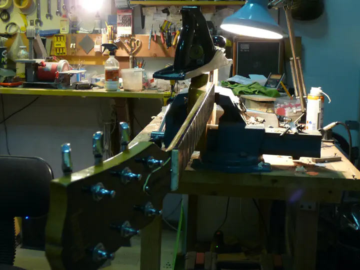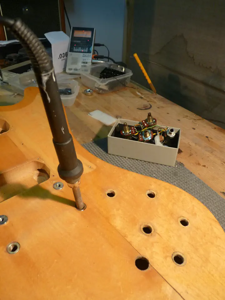 Я чуть не запорол весь ремонт, потому что не уделил внимания каналу под провода. Ясно, что он тоже несколько изменился в результате описанной процедуры. А сверлится-то он на фабрике, со стороны паза под гриф, еще до установки последнего! Поэтому пересверлить его по-человечески на собранной гитаре невозможно. Мне повезло: там осталась узкая сквозная дырка, которую я кое-как раздолбил длинным тонким сверлом до нужного диаметра, грязно ругаясь. Если бы не повезло, то возни было бы очень много.