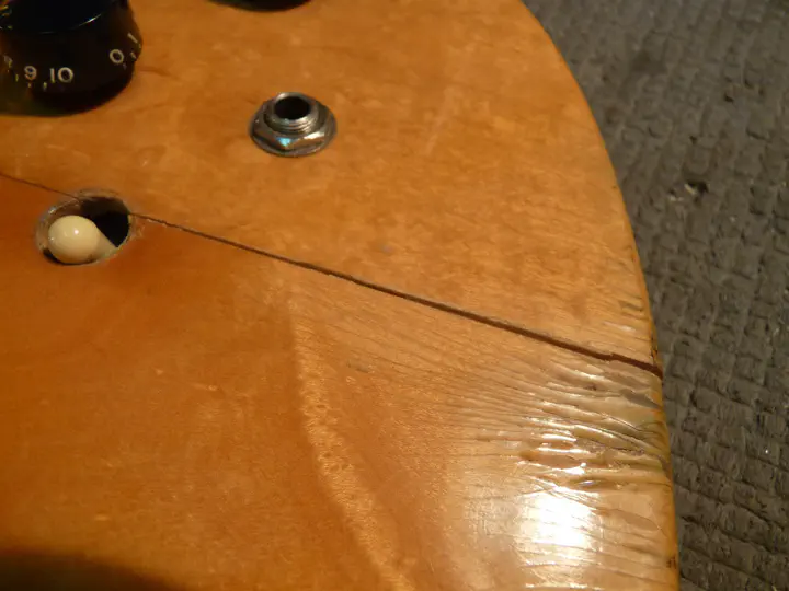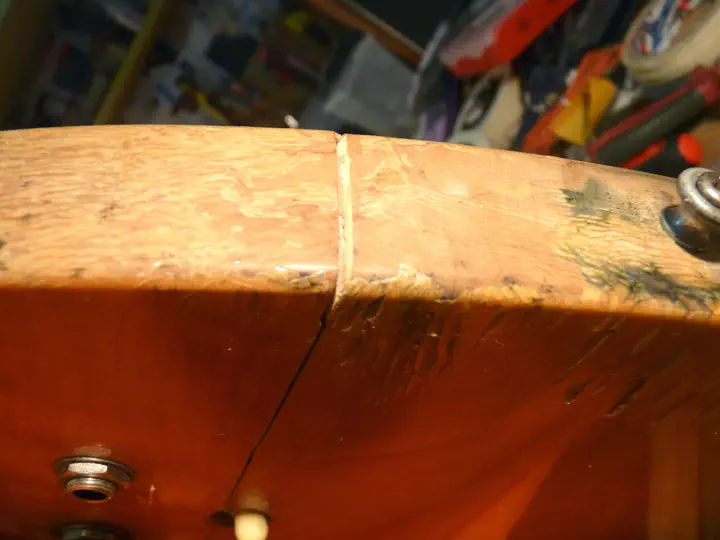 Увы, когда гитара прибыла в Россию, а потом и в мастерскую, обнаружилось, что ситуация гораздо хуже, чем я думал. Во-первых, на клене рядом с трещиной — огроменная свилеватость (внимание на светлую полосу в нижней части фотографии), и потому сама деревяшка там кривовата: