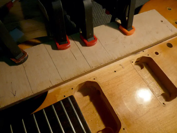 Пока гитара красилась, я заказал для нее шаблон под крышку. Он вырезан на ЧПУ-фрезере и точно соответствует ей по форме. Подрезаю верхнюю грань паза: