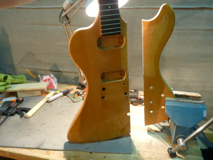 Я предложил хозяину доломать склейку, выстругать поверхности и склеить корпус обратно. Небольшое расхождение в длине половинок, которое получится после этой процедуры, спрячется в нижнем роге, — его можно будет немного подрезать, это совершенно не страшно. Ширина корпуса уменьшится на 2-3 мм — это тоже не страшно, потому что на собранной гитаре их никто не заметит. Ну и, разумеется, без перекраски тут уже не обойтись. Поскольку таковая все равно планировалась рано или поздно, владелец согласился на все эти процедуры довольно легко.