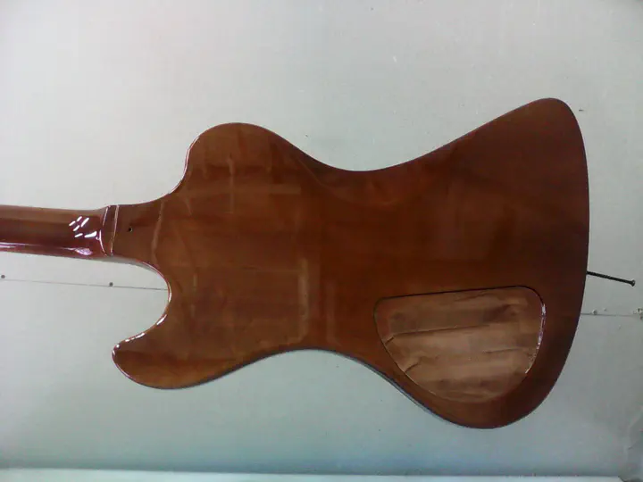 Оттенок не кажется близким к образцу, но тут специфическое освещение и не самая разумная камера. На обычном свете оттенок у гитары темно-коричневый, как и положено.