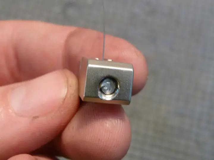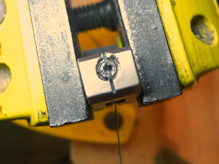 Сверлить экстрактор можно даже не пытаться; сталь у него очень твердая, тверже большинства сверел. Перехожу к плану “Б”, беру дремель с тонким отрезным диском.
