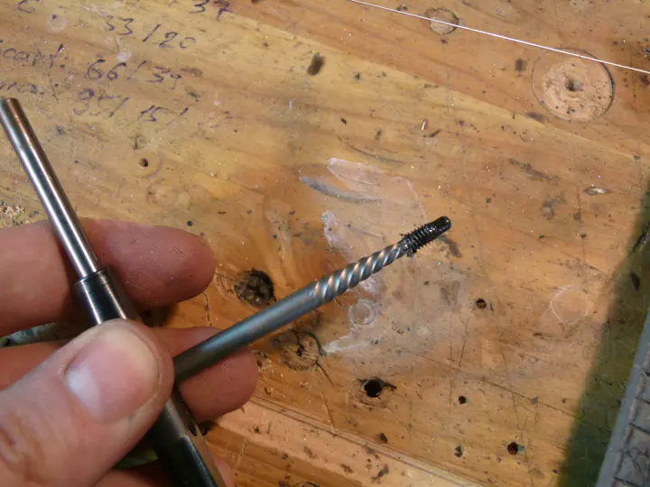 Получился неплохой шлиц под мелкую плоскую отвертку, но шансов, что ей получится сдвинуть винт, мало: прямой шлиц не даст той нагрузки, которую обеспечивал шестигранник. Зато, поковырявшись мелкой отверточкой в прорези, я неожиданно выковырял оттуда обломок экстрактора! Повезло. Значит, сверлим дальше, только уже сверлом покрупнее.