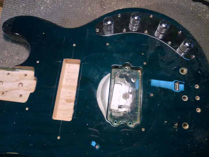 Поскольку просверлить аккуратное отверстие до темброблока напрямую почти невозможно, я делаю небольшой паз под провод. Как на телекастере.