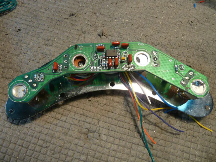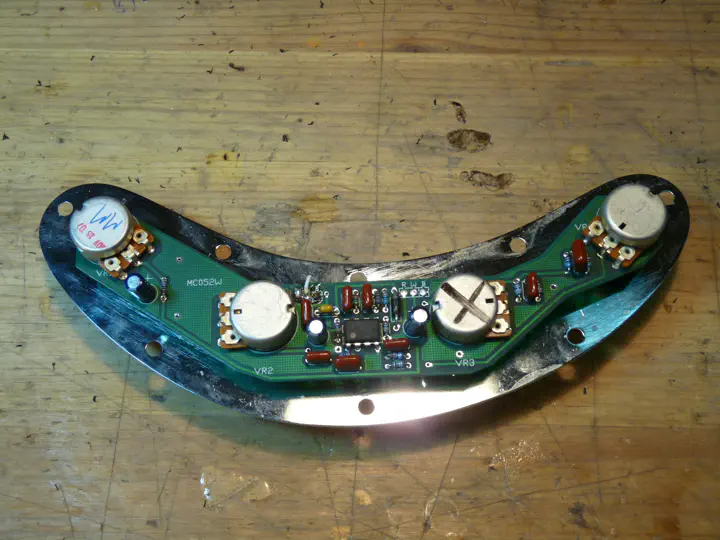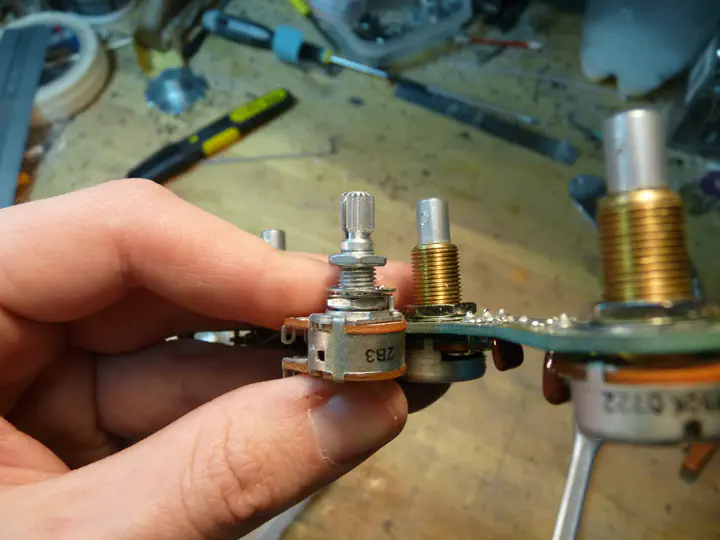Чтобы все получилось, мне пришлось умеренно заколхозить темброблок. Приведенные ниже фотографии и рассуждения применимы для темброблока с четыремя крутилками (vol, hi, mid, lo). Если на вашем мюзикмэне крутилки три, а четвертое отверстие занято гнездом, то сценарий придется изменить. Например, вынести гнездо на боковину корпуса или поставить стековый потенциометр.