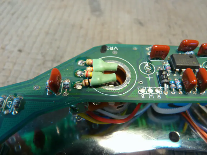 Последний этап — установка “обманок” на пустые контакты регулятора средних частот. Там стоял линейный пот на 50 КОм со средней точкой. Соответственно, я повесил два сопротивления по 25 КОм, тем самым сымитировав центральное положение потенциометра.