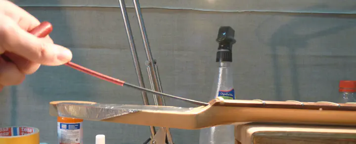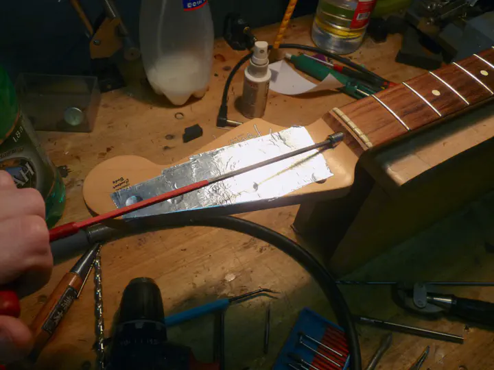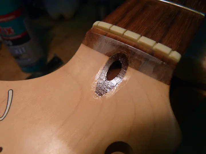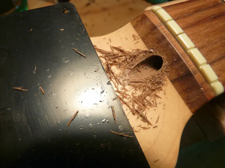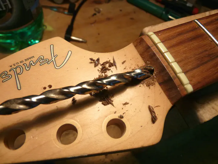 Поэтому при малейших подозрениях на срыв гайки я всегда беру длинное тонкое сверло порядка 3 мм и им шурую в отверстии. Вручную. После этого достаточно потрясти гриф головой вниз, чтобы из него вылетел весь хлам, который мешал ключу залезть в гайку.
