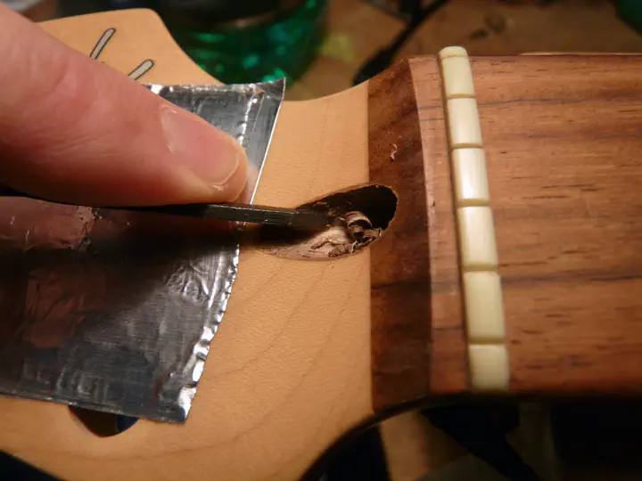 Безопаснее всего убирать ореховую пробку механически: сверлами, стамесками и т.д. Соблазнительно, конечно, сунуть в нее паяльник и подогреть до размягчения клея. Это даже работает. Больше того, если гайка еще хоть немного живая, можно ей же и вытолкнуть пробку, как клей ослабнет. Но есть нюанс, и заключается он в том, что паяльник может поджарить лак далеко за границами пробки. Так что это хороший вариант только под полный перекрас морды.