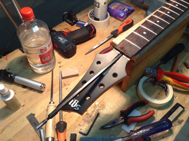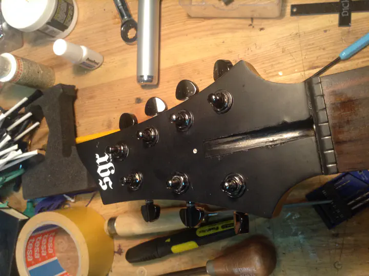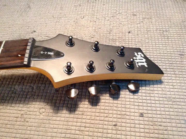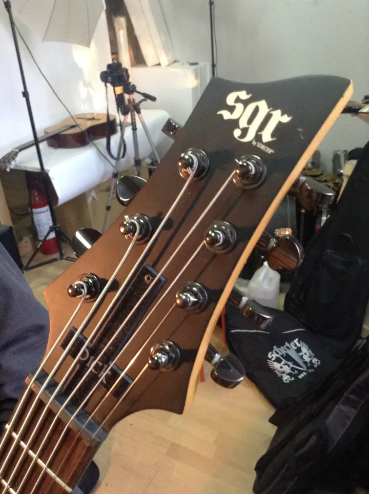 Итак, в мастерской появляется семиструн “SGR by Schecter”, хозяин которого по неопытности сорвал шлиц на гайке двухстороннего анкера. Гитара почти новая; даже гарантия еще не кончилась, но ремонт, конечно, не гарантийный.