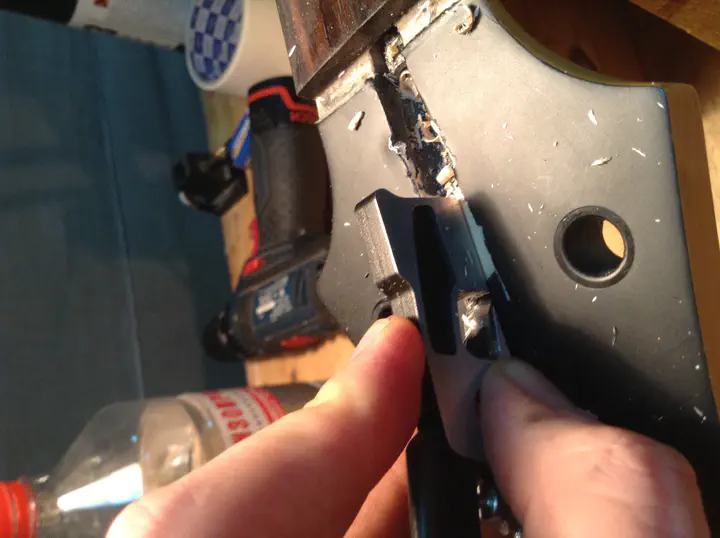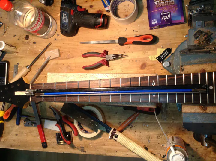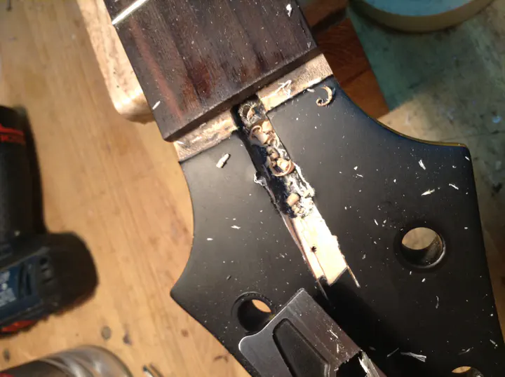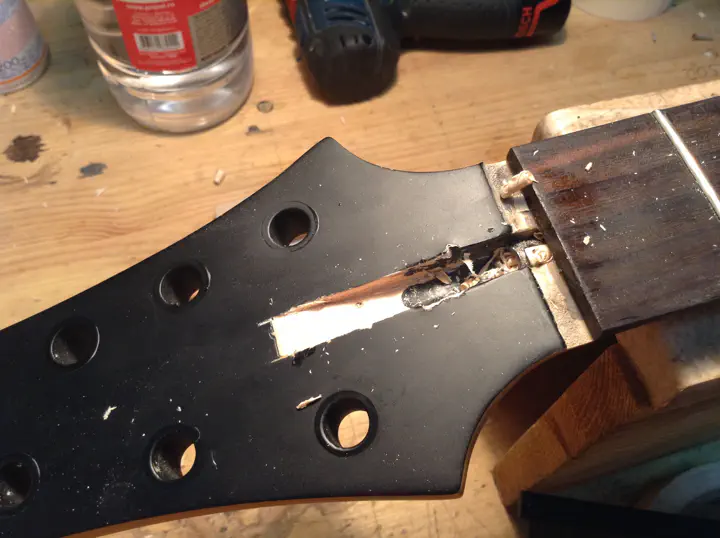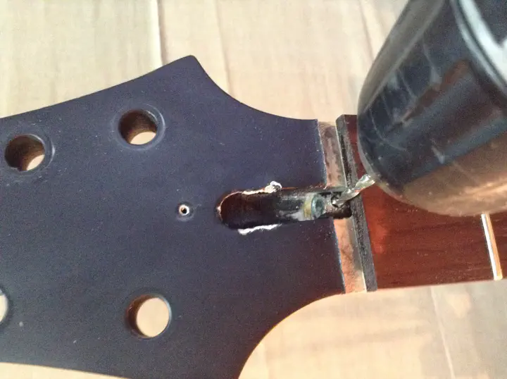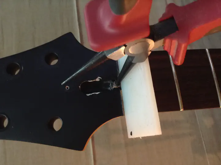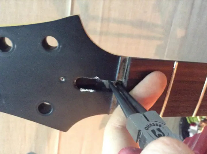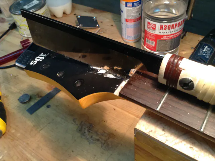 Главный риск заключается в том, что анкер совершенно не обязан вытянуться. Я уже писал об этом в первом отчете. Анкер может быть сильно зажат между грифом и накладкой, или намертво приклеиться. Инженеры “шектера” вовсе не рассчитывали на то, что кому-то придет в голову извлекать анкерный стержень таким образом. Плохо зафиксированный анкер в ослабленном состоянии может противно громыхать и резонировать при игре, так что в гриф его сажают плотно.