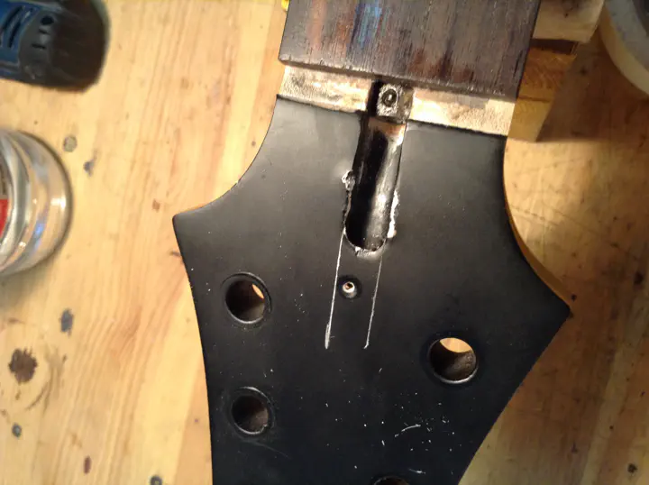Что у нас есть еще? Да, хочется вынуть анкер через горло, как я делал с тем басом. Ситуация очень похожая: на нашем SGR тоже голова под углом, тоже двухсторонний независимый анкер, - только нет пластины на голове грифа, которая так помогла в том ремонте.