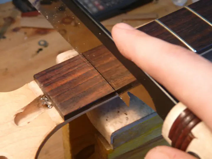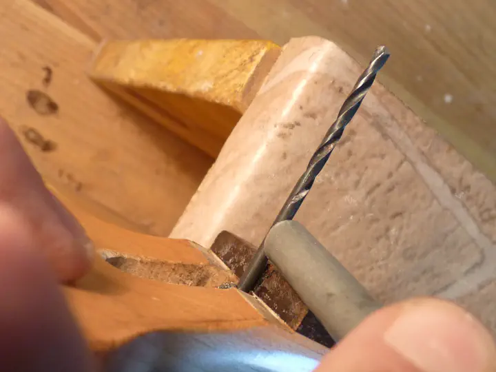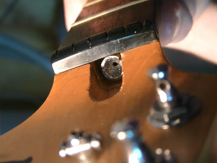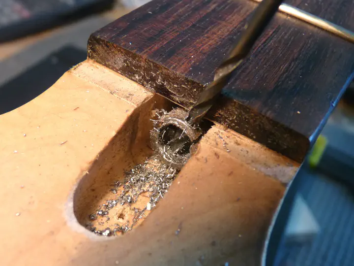 Сверлю новое отверстие, чтобы прокрутить гайку дальше. Нужно соблюдать большую осторожность, чтобы не прошить гриф насквозь.