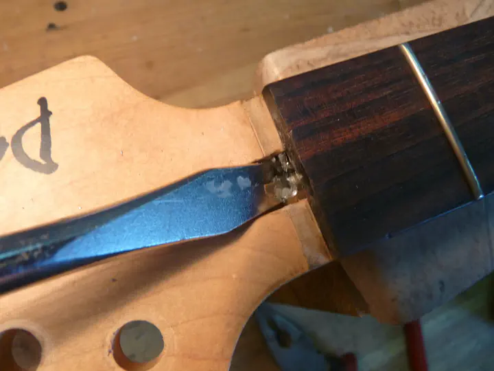Чтобы снять нагрузку с анкера, слегка выгибаю гриф струбцинами. На прутковых анкерах (Gibson, Fender и прочие консерваторы) этот маневр иногда помогает. На прямых односторонних анкерах современной конструкции (в том числе на этой “пацифике”) большой пользы от такого изгиба нет, но это хоть какой-то шанс помочь делу.