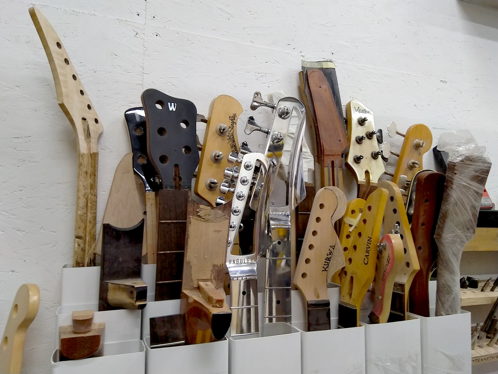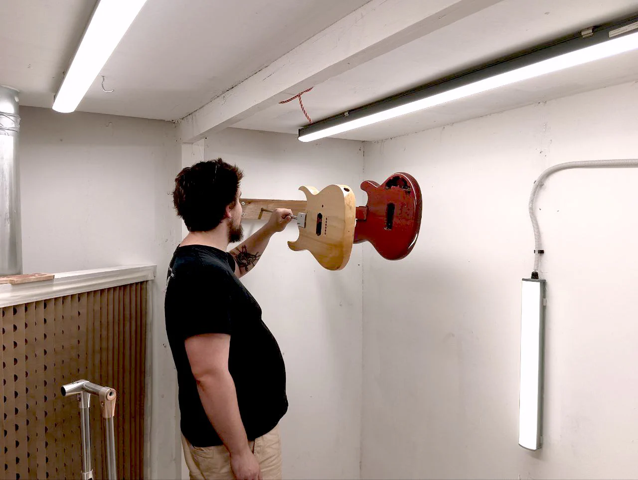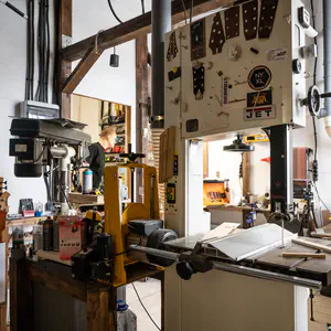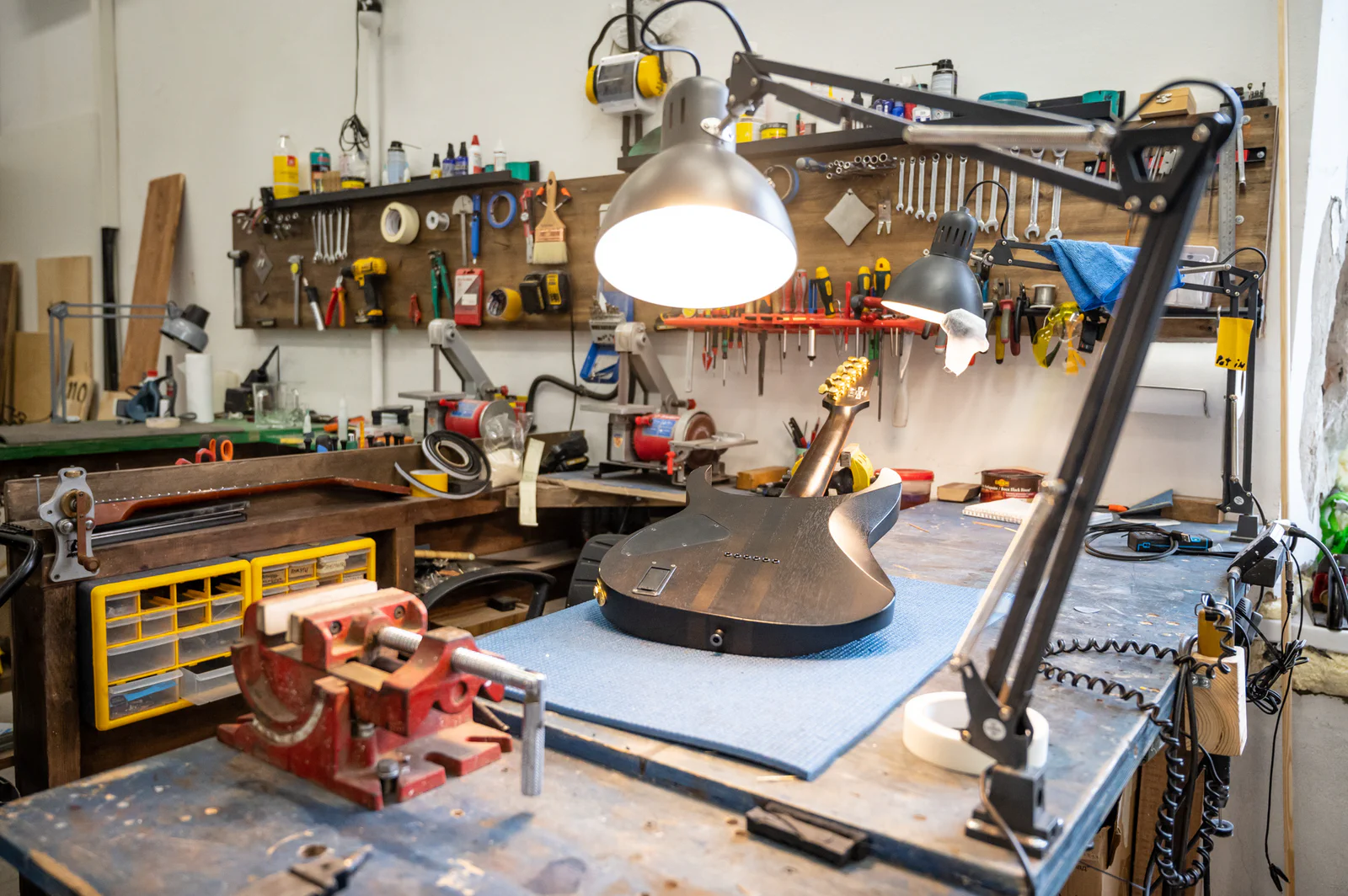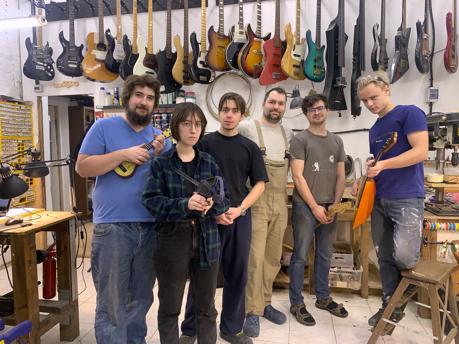 Прекрасно оснащенная мастерская: покрасочная камера, полный парк станков и многочисленные приспособления для специализированного ремонта. Мы делаем все: можем поменять струны, а можем изготовить новую гитару.